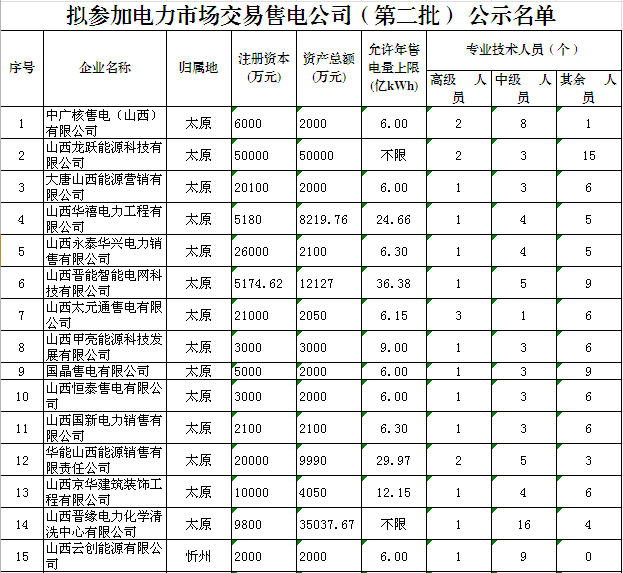 中科宇杰:關(guān)于山西省第二批參加電力市場交易售電公司名單