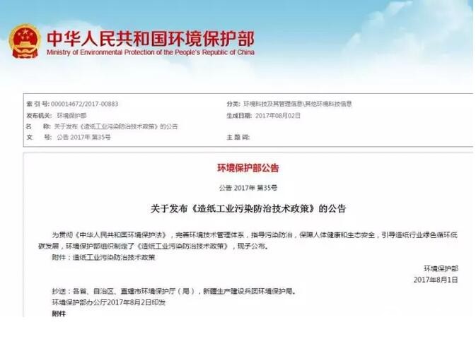 為貫徹《中華人民共和國環境保護法》,完善環境技術管理體系,指導污染防治,保障人體健康和生態安全,引導造紙行業綠色循環低碳發展,環境保護部組織制定了《造紙工業污染防治技術政策》。