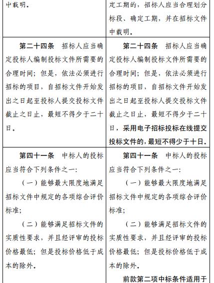 五、將第二十四條修改為:“招標人應當確定投標人編制投標文件所需要的合理時間;但是,依法必須進行招標的項目,自招標文件開始發出之日起至投標人提交投標文件截止之日止,最短不得少于二十日,采用電子招標投標在線提交投標文件的,最短不得少于十日。”