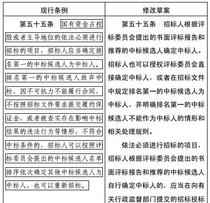 一、將第五十五條修改為:“招標人根據評標委員會提出的書面評標報告和推薦的中標候選人確定中標人。招標人也可以授權評標委員會直接確定中標人,或者在招標文件中規定排名第一的中標候選人為中標人,并明確排名第一的中標候選人不能作為中標人的情形和相關處理規則。