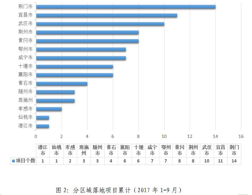 2017年1-9月,累計新落地項目數排名:荊門市(14個)、宜昌市(11個)、武漢市(10個)、荊州市(8個)、黃岡市(8個)、荊州市(8個)、鄂州市(7個)、咸寧市(7個)、十堰市(6個)、襄陽市(6個)、黃石市(4個)、隨州市(3個)、恩施州(3個)、孝感市(2個)、仙桃市(1個)、潛江市(1個)。