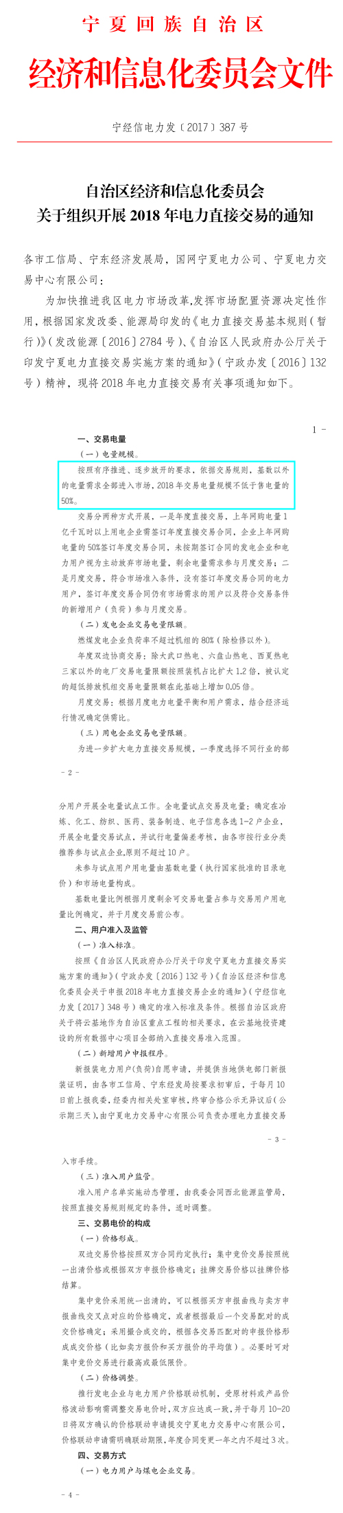 近日,寧夏經信委發布《關于組織開展2018年電力直接交易的通知》(以下簡稱“通知”),通知中稱,基數意外的電量需求全部進入市場,2018年交易電量不低于售電量的50%。