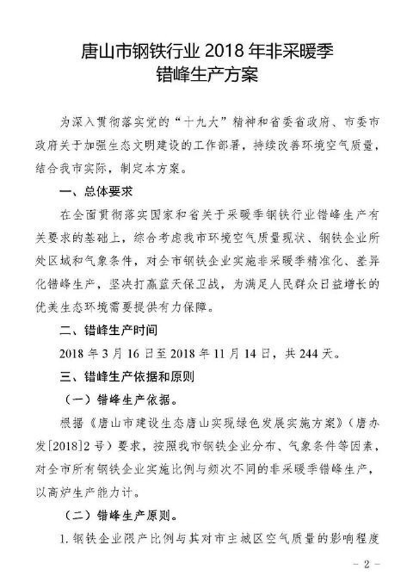 日前,《唐山市鋼鐵行業2018年非采暖季錯峰生產方案》經市政府同意,已正式下發。方案中明確了錯峰生產依據和原則,綜合考慮唐山市環境空氣質量現狀、鋼鐵企業所處區域和氣象條件,對全市鋼鐵企業實施非采暖季精準化、差異化錯峰生產。全文如下: