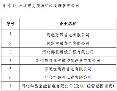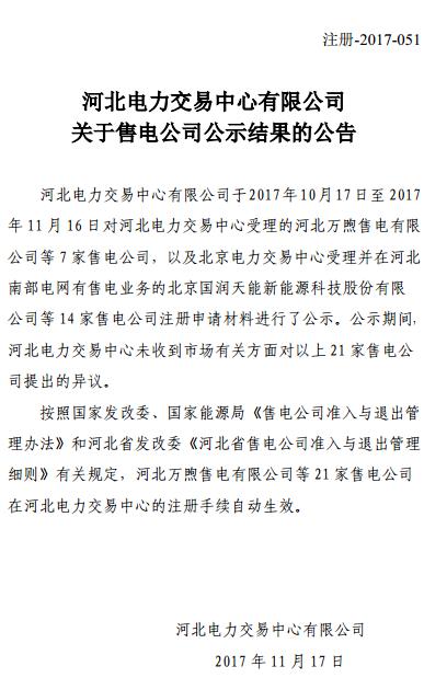 11月17日,河北電力交易中心發布了《關于售電公司公示結果的公告》,公告稱10月17日至11月16日,河北電力交易中心受理河北萬煦售電有限公司等7家售電公司,以及北京電力交易中心受理并在河北南部電網有售電業務的北京國潤天能新能源科技股份有限公司等14家售電公司注冊申請材料進行了公示,公示期間未收到異議,這21家售電公司注冊手續自動生效。