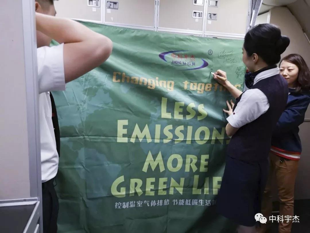 ?本次公益宣傳愛心傳遞活動得到國航CA877機組成員大力支持,據(jù)乘務(wù)長介紹國航一直注重綠色低碳,國航機組成員作為節(jié)能減排的倡導(dǎo)者,保護環(huán)境,人人有責(zé),通過參與中科宇杰本次活動,呼吁全球共同參與,傳遞正能量,積極參與的溫室氣體減排行動。“Less Emissions More Green Life”活動,并在的綠色宣傳旗上簽字,節(jié)能低碳我先行,共同參與,共同倡導(dǎo),節(jié)能低碳生活新風(fēng)尚。