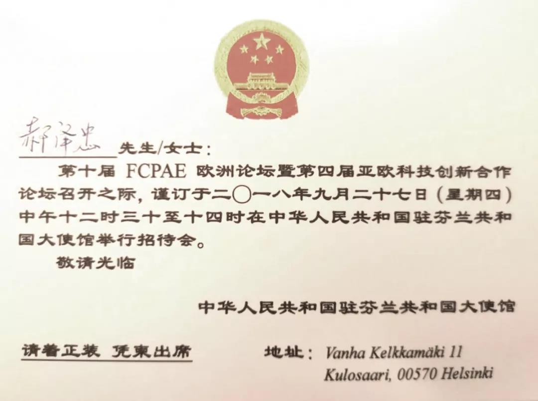 全球公益系列活動(dòng)在芬蘭傳遞期間正值第十屆FCPAE歐洲論壇暨第四屆亞歐科技創(chuàng)新合作論壇在芬蘭赫爾辛基召開(kāi),倡導(dǎo)環(huán)保節(jié)能低碳的公益活動(dòng)得到了論壇舉辦方以及中國(guó)駐芬蘭大使館的廣泛關(guān)注和大力支持,以中科宇杰董事長(zhǎng)郝澤忠為代表的宣傳團(tuán)一行受邀出席中國(guó)駐芬蘭大使館招待會(huì)。