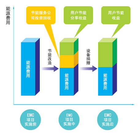 EMC 為客戶提供能源系統(tǒng)診斷、節(jié)能項目可行性分析、節(jié)能項目設計,幫助項目融資,選擇并采購設備、安裝調試、進行項目管理、培訓操作人員、合同期內系統(tǒng)設備維 護、節(jié)能量監(jiān)測等一條龍服務,然后與客戶共同驗證項目的節(jié)能效果、環(huán)境效益與經濟效益,最后,與客戶分享項目實施后取得的經濟效益,回收項目的投資和獲得 應有的利潤。